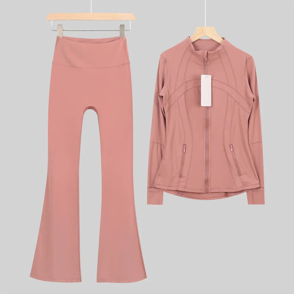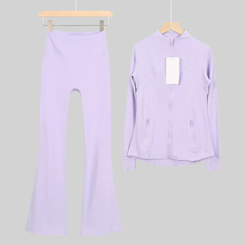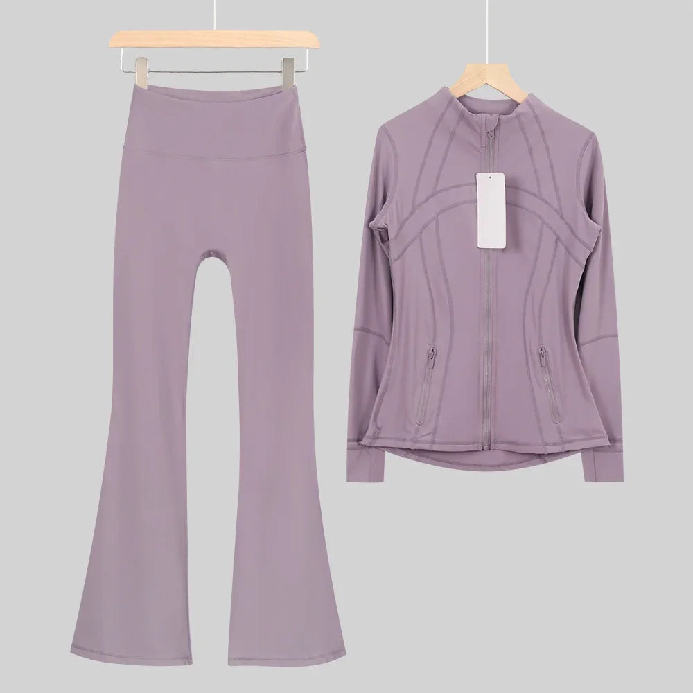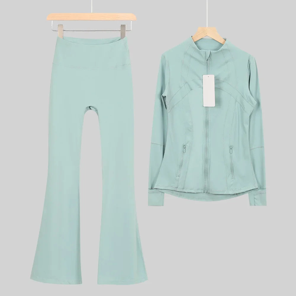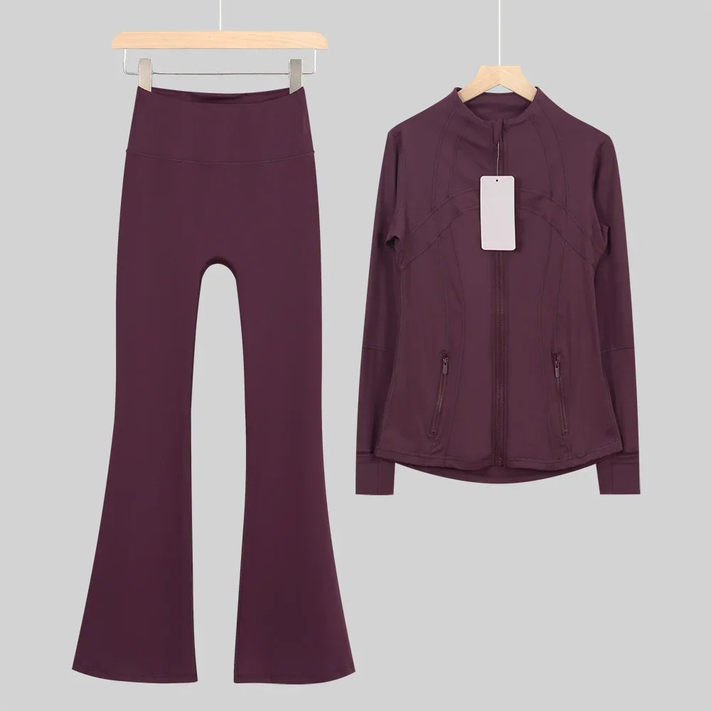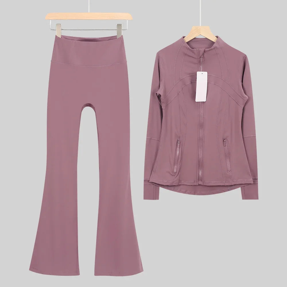 طقم متكامل يجمع بين الأداء الرياضي، الراحة، والأناقة اليومية، مناسب لكل نشاطاتك الرياضية والمشاوير اليومية( image colorimage col / 10 ) - https://glow-fitstore.com/products/woman-with-long-sleeves-yoga-outfit-two-pcs-suits-long-pants-coat-elasticity-running-bell-bottoms-jacket-suit-gym-set-women?variant=43680877150317
